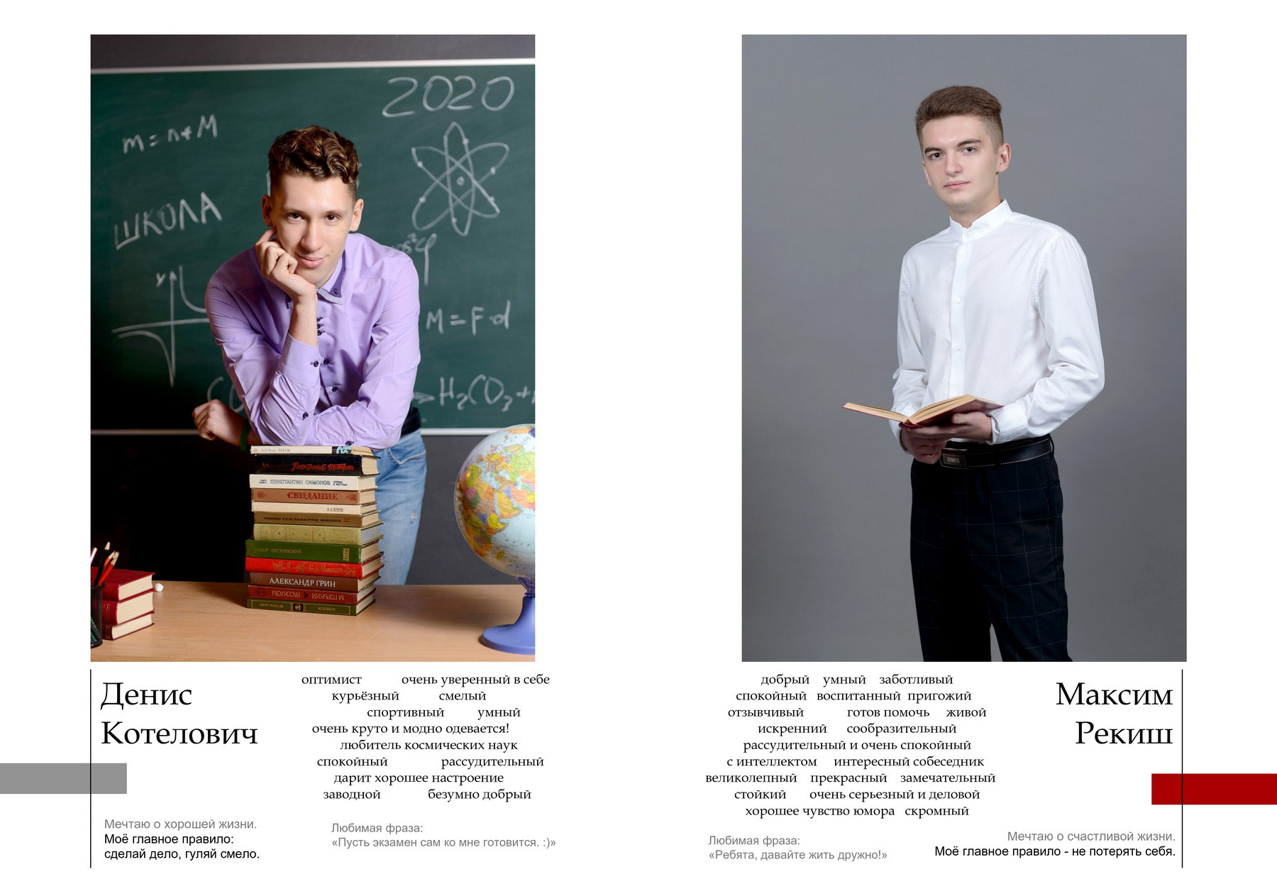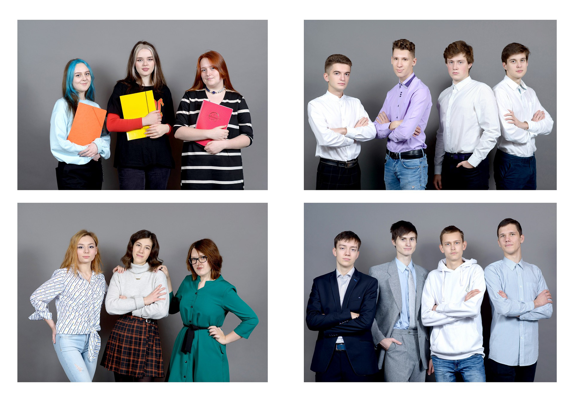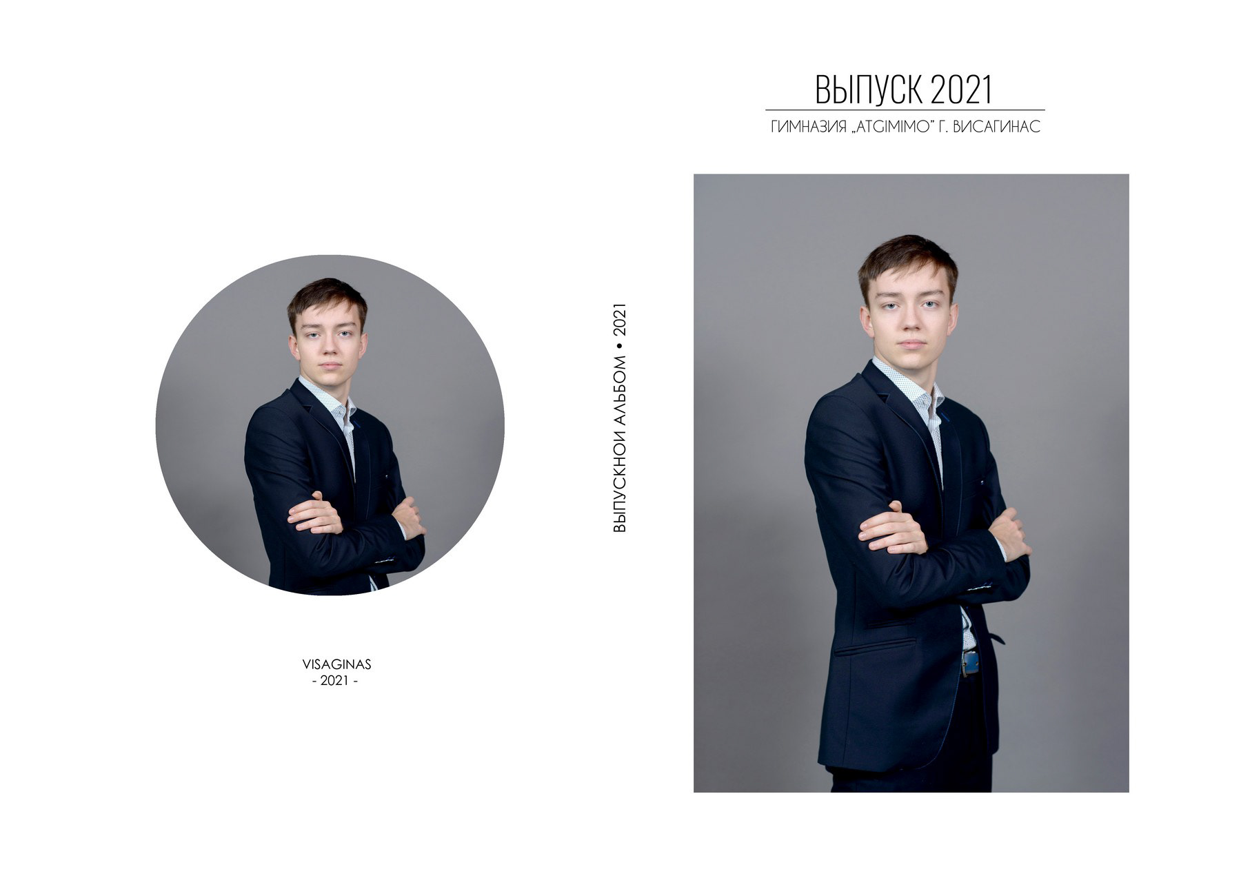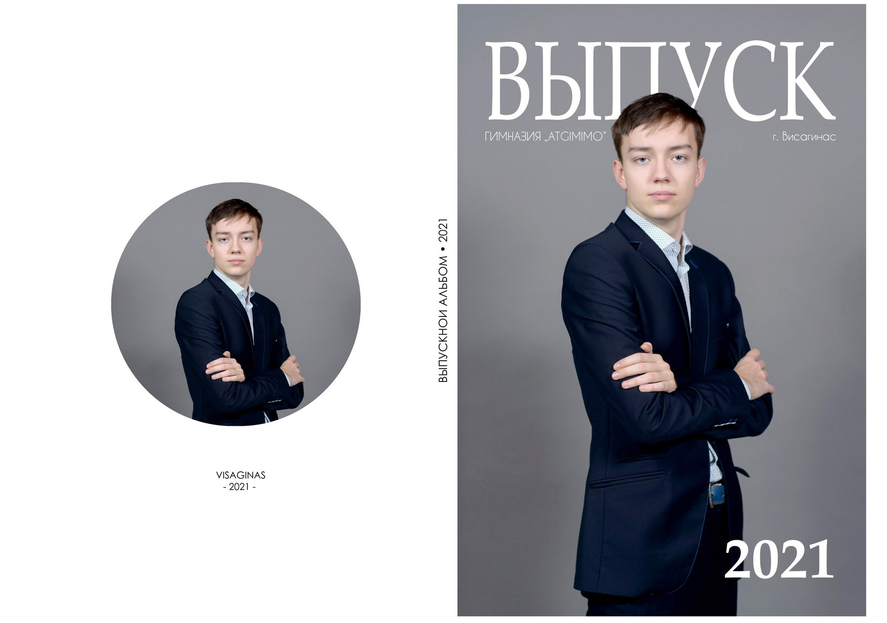 Пример выпускного альбома для старших классов. Съёмка в студии. Здесь показано 4 примера обложки, далее идут портреты всех учеников класса с высказываниями и цитатами, и в завершение - несколько страниц с групповыми фотографиями.