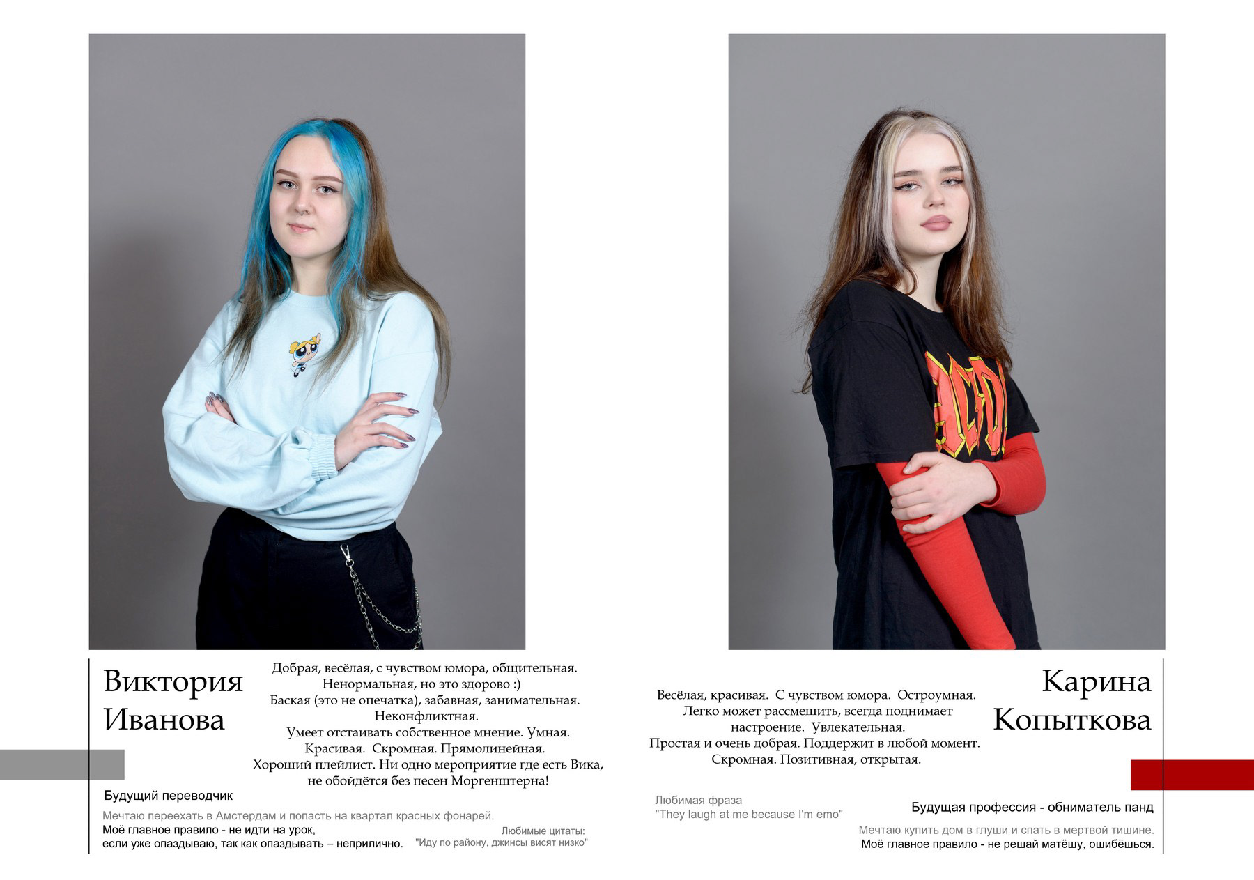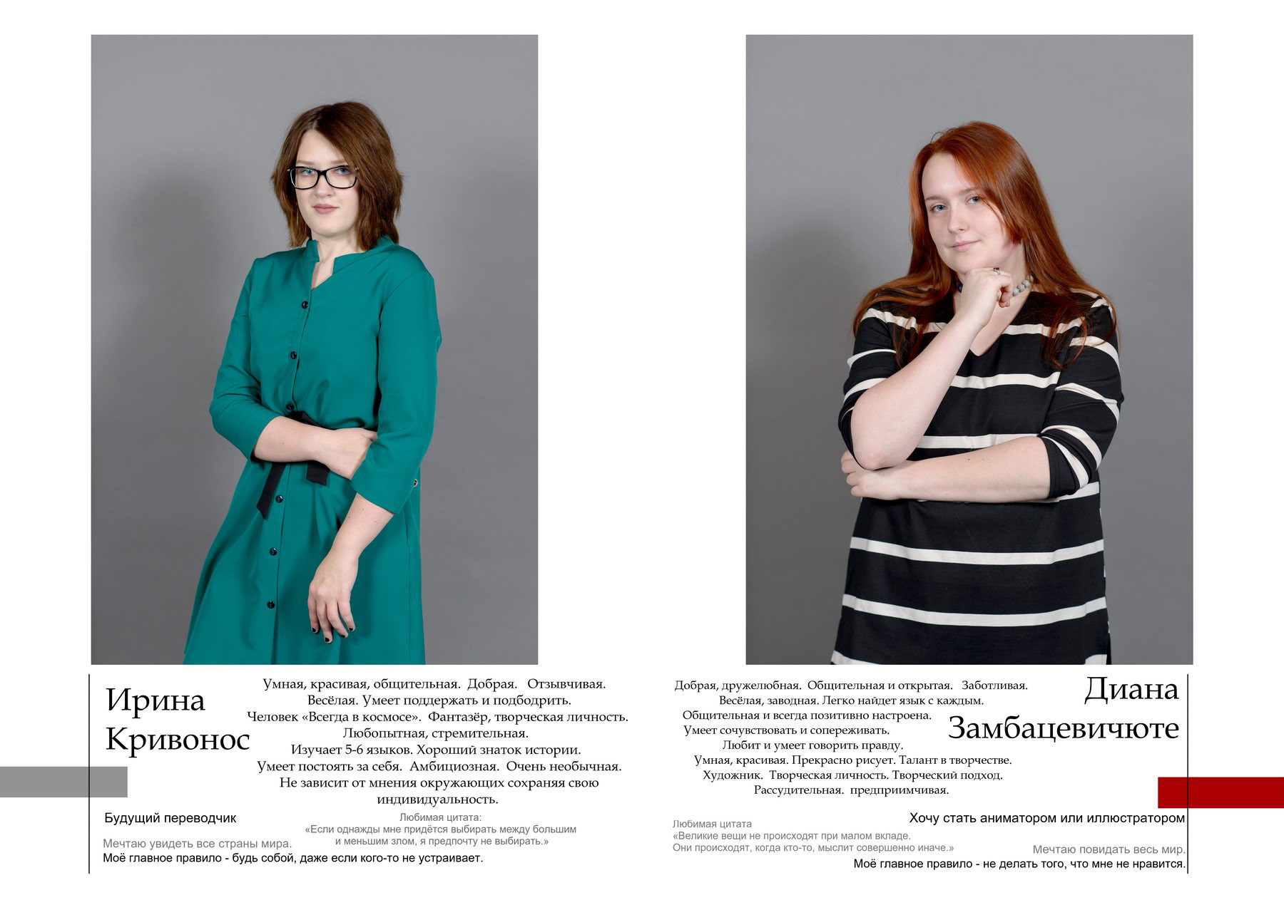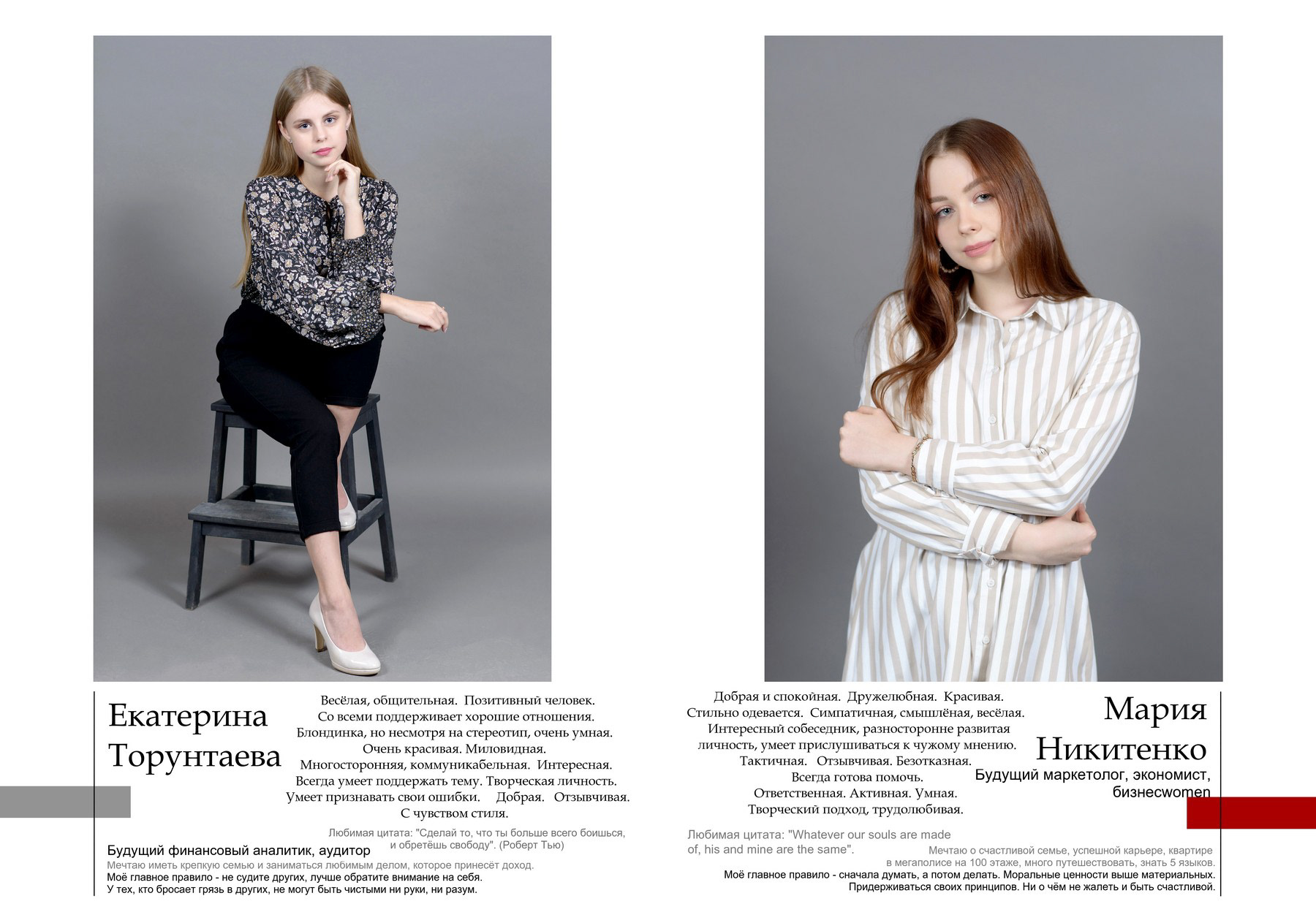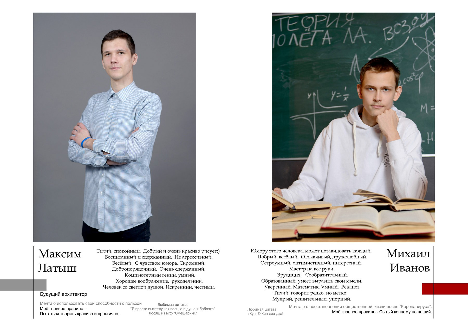 Пример выпускного альбома для старших классов. Съёмка в студии. Здесь показано 4 примера обложки, далее идут портреты всех учеников класса с высказываниями и цитатами, и в завершение - несколько страниц с групповыми фотографиями.